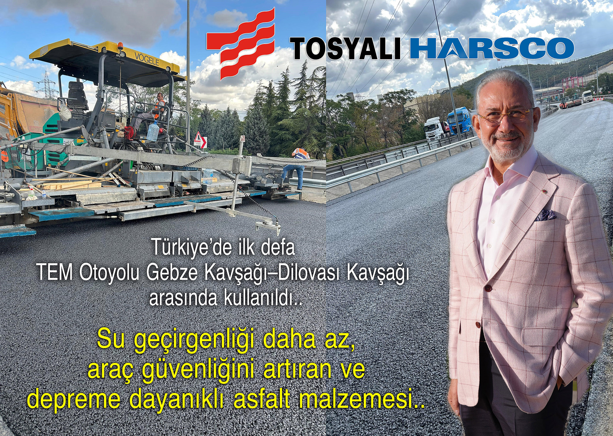 Tosyalı’nın geri dönüşümde uzman şirketlerinden Tosyalı Harsco tarafından yoğun bir Ar-Ge çalışması sonucunda geliştirilen su geçirgenliği daha az, araç güvenliğini artıran ve depreme dayanıklı asfalt malzemesi Türkiye’de ilk defa TEM Otoyolu Gebze Kavşağı–Dilovası Kavşağı arasında kullanıldı.