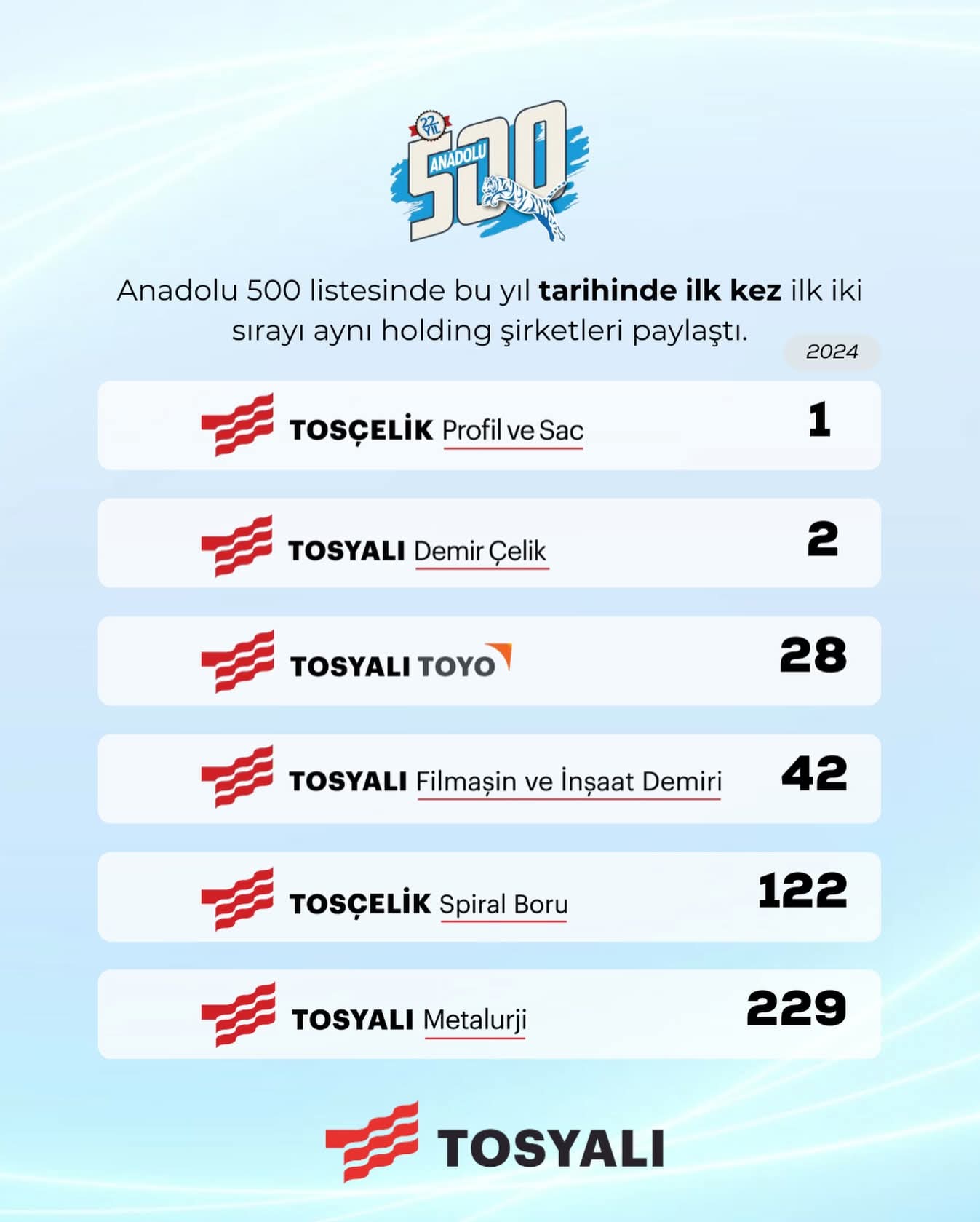 Tosyalı Toyo 28. sıraya yükselirken, Tosyalı Filmaşin ve İnşaat Demiri 42, Tosçelik Spiral Boru 122 ve Tosyalı Metalurji 229. sırada yer buldu.