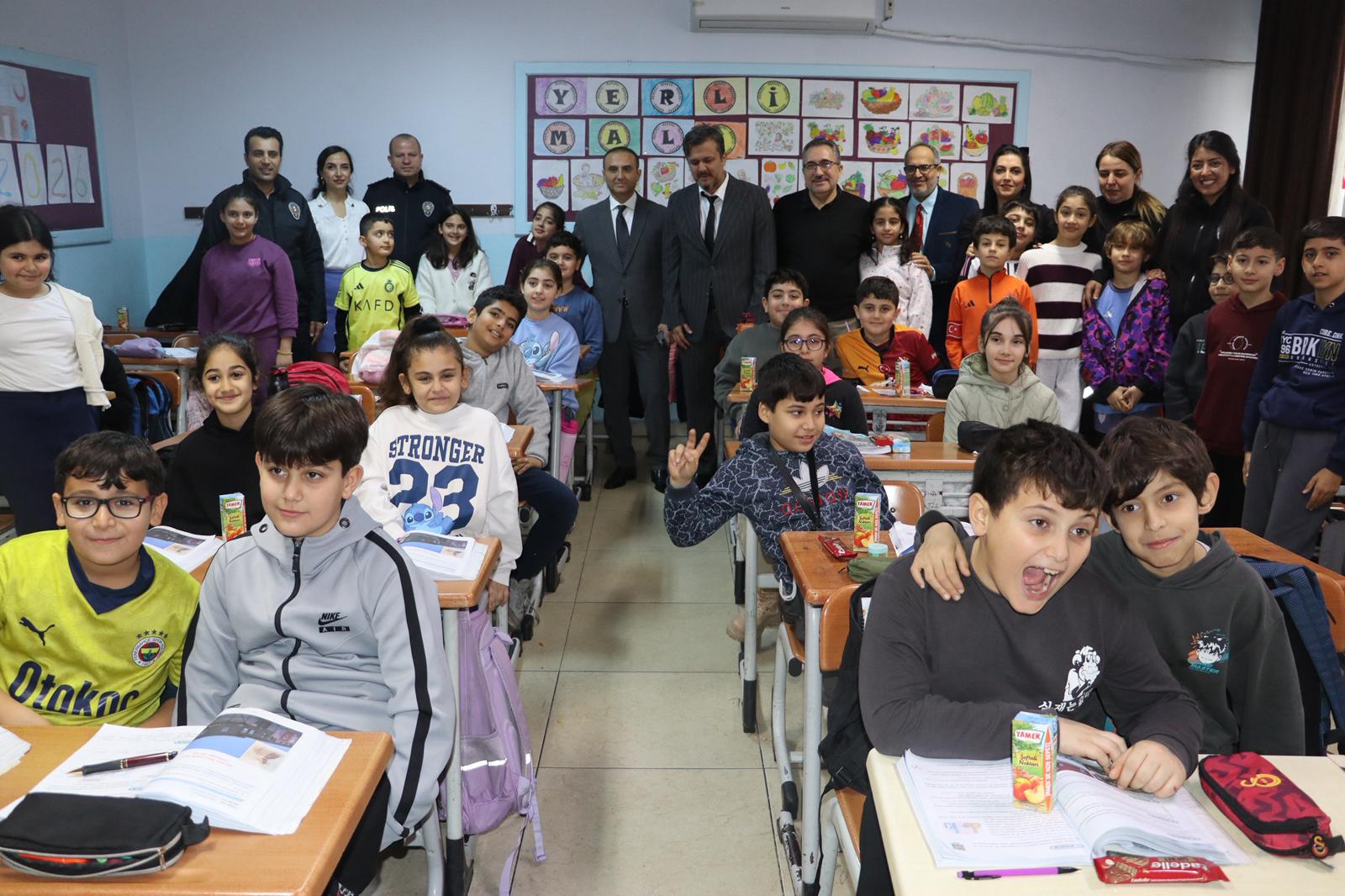 Emniyet Müdürü Güneş ve polis memurları öğrencilere çeşitli armağanlar dağıtarak çocuklarla yakından ilgilendi.