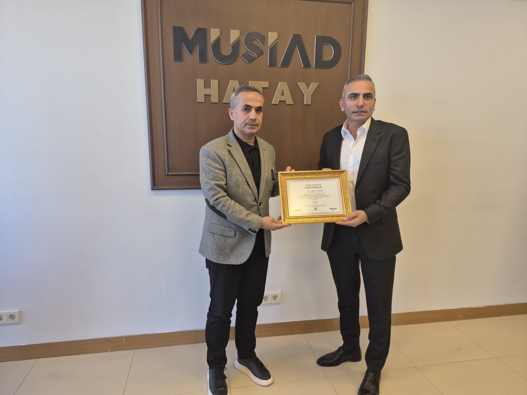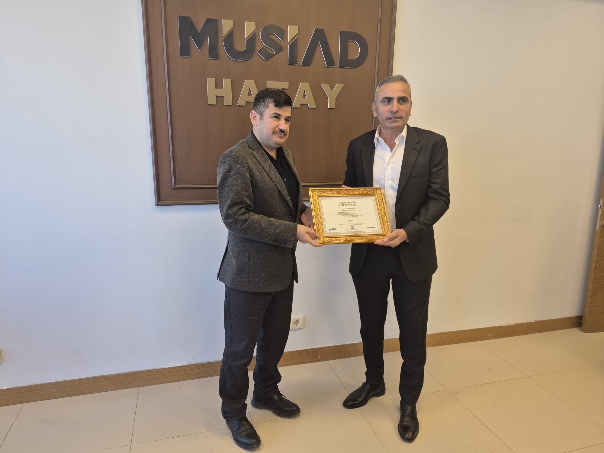 MÜSİAD Hatay Başkanı Ahmet Akyüz, misafirlerine Yetim Hamiliği Sertifikası takdim ederek, nazik ziyaretleri ve takdim edilen Türk Bayrağı için teşekkürlerini iletti.