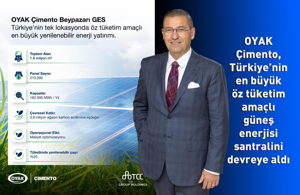 OYAK Çimento, 97,8 MWe / 115,5 MWp kurulu güce sahip yeni güneş enerjisi santralini Ankara Beypazarı’nda devreye aldı. Türkiye’de bir sanayi üreticisi tarafından tek bir lokasyonda öz tüketim amacıyla hayata geçirilen en büyük yenilenebilir enerji projesi olma özelliği taşıyan santral OYAK Çimento Fabrikaları A.Ş.’nin toplam enerji kullanımında yenilenebilir enerjinin payını yüzde 25’e yükseltecek.